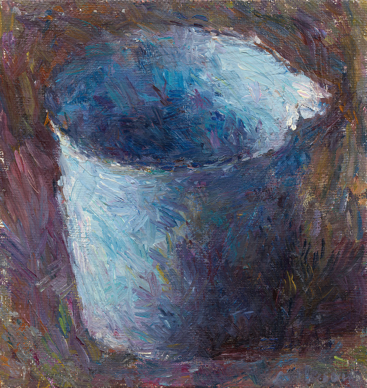 Everyday objects such as a light blue bucket and two dark blue gas cartridges form the subjects of Daniel Enkaoua's two still lifes. The painter concentrates entirely on the objects, which stand on a violet-brown background and in front of a slightly darker, yet also violet-brown background. Light falls on the objects and the spatial elements from the left. All the objects in the two still lifes are constructed with numerous clearly visible brushstrokes and a whole range of colour tones. In addition to the different shades of blue, there are shades of green, violet, brown, orange and white. Only when viewed from a distance do the objects materialise into a light blue bucket and dark blue gas cartridges.
