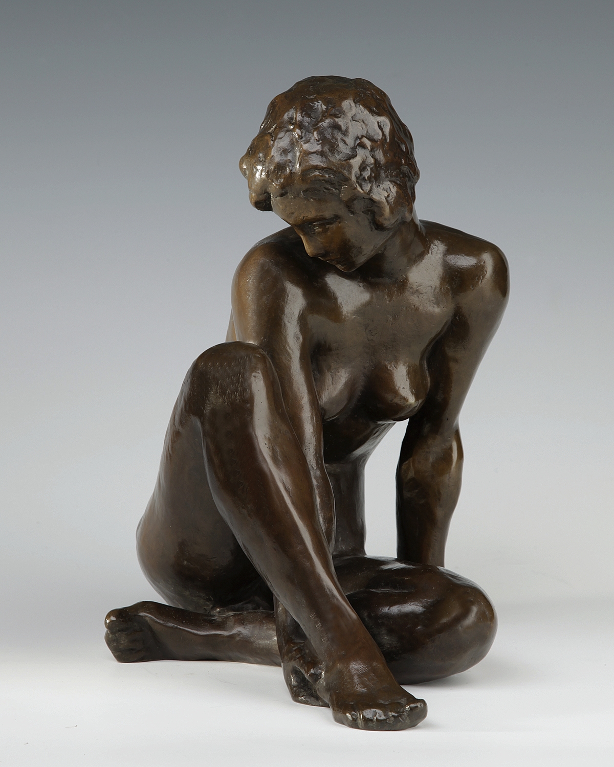 Klimsch's nephew acquired a copy of the figure in 1924, from which it can be deduced that the undated model was created before or in 1924 at the latest (Braun, 1991). Determined by the triangle in its composition, the nude has a closed outline. The lowered head and gaze give the female figure an inward-looking, melancholically absorbed expression. The form and emotional content of the figure thus combine to form a harmonious unity. Klimsch's female nudes, who rarely works directly in front of the model, are characterised by a lifelike, lively and contemporary (e.g. hairstyle), but primarily idealised form. In his works, Klimsch sought to combine Adolf von Hildebrand's "feeling for the architectural and static", Auguste Rodin's "liveliness of form and expression" and the ideal of classical antiquity (Fritz Klimsch, 1937).