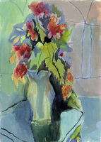 Request artwork: Heinrich Steiner, Vase with pink flowers on a blue table