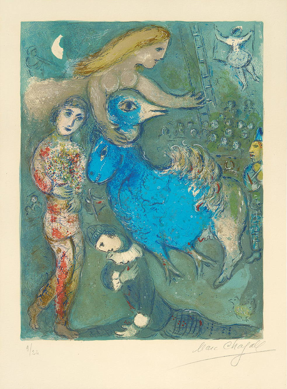 dem Gebiet der Druckgrafik einer der großen Meister. Mit der Farblithografie beginnt Chagall sich intensiv ab 1950 im Atelier von Fernand Mourlot (1895-1988) zu beschäftigen. Bald schon wird sie zu seiner bevorzugten druckgrafischen Technik und zu einem seiner wesentlichen Ausdrucksmittel. Chagalls Folge Cirque, zu der 23 Farblithografien gehören, wird 1967 bei Tériade (Paris) als Buchedition publiziert, sowie von den 23 Farblithografien zudem eine Edition von nur 24 signierten und nummerierten Exemplaren mit breiten Rändern gedruckt.
