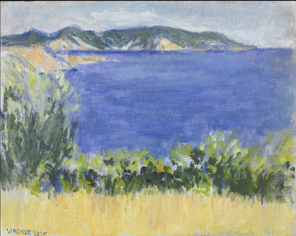 Reiner Wagner was born in Hildesheim in 1942. Coming from a family of musicians, he learnt to play the violin as a child, then the piano and sang in a boys' choir. In 1957, during a holiday on the island of Corsica, he discovered his love of painting. After finishing school, Wagner finally decided against a career as a musician and studied from 1961 to 1964, first at the Academy of Fine Arts in Munich (under Hermann Kasper) and then at the Academy of Fine Arts in Berlin. In 1965, Wagner moved to Corsica with his wife Ingrid, where he created his first landscape paintings of the Mediterranean island. After the birth of their first son, Wagner first moved to Munich, then to Lake Starnberg when their second son was born. A friendly relationship developed with Galerie Günther Franke, Munich, which represented the artist from 1972-1977, with Galerie Gunzenhauser, Munich, which exhibited Wagner from 1978-2001 and looked after his work (1996 catalogue raisonné, 1965-1995), and then from 1989 with Galerie Koch in Hanover. Wagner's first museum exhibition took place in 1979 at the Weilheim City Museum (also 1981, 1992, 2002), followed by exhibitions at the Schongau City Museum (1990, 1994). To this day, Wagner regularly shows his works at the Galerie Koch in Hanover. - Wagner's work includes oil paintings, watercolours and woodcuts of landscapes and still lifes. His landscapes always reflect his living environment, on the one hand the Bavarian Alpine foothills from Lake Starnberg southwards towards the towns of Iffeldorf, Kochel, Murnau with their lakes, moors and the Bavarian Alps, from the Walchensee mountains and Walchensee via Krün, Wallgau to the Karwendel mountains, and on the other hand the western Corsican, Mediterranean mountain landscape with the sea, which the painter still visits in the summer months. Wagner's landscapes, although orientated towards visible reality, are by no means vedute, but reduce the nature seen to its essential forms, reflecting its atmospheric mood as well as the painter's own experience, his dialogue with nature. Wagner's landscapes often consist of clearly separated landscape zones, sometimes layered parallel to one another in the painting. The colour palette is reduced to a few colours, even concentrating on just one colour in various shades of light and dark (e.g. Walchensee pictures). The renunciation of details, the tendency to combine diversity into a few large areas and the reduction of the richness of colour simplify and abstract the natural model, allowing the eye to linger. Impressions such as seriousness, calm, inwardness, loneliness, emptiness, but also cheerfulness and clarity are part of his landscape paintings.