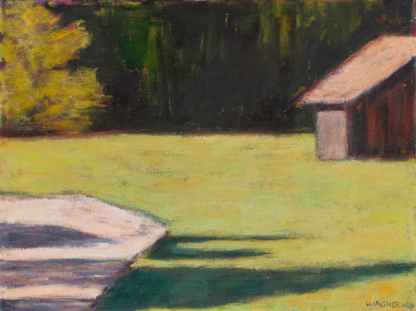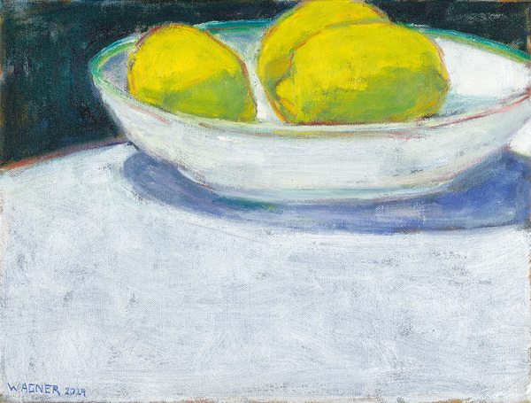 Although people are absent from Reiner Wagner's landscapes, he does not show unspoilt nature. Paths, barns, farmsteads and boathouses, which the artist reduces to their basic forms, bear witness to the presence of man. With their red, orange-red, blue or violet colouring, the roofs of the barns often form a clear colour accent in the composition, sometimes complementing the green of the flora or the blue of the sky and the mountains; a creative intervention in the topographically given, which underlines the fact that Wagner's landscape paintings are not an image of what he has seen, but a mental processing of what he has seen. This also characterises Wagner's still lifes, which show objects from his immediate living and working environment: Cups, bowls and plates, fruit, individual flowers in often glass vessels as well as the painter's working materials, paint tubes, chalks, paint tins and brushes. The creative impulse is usually triggered by a random constellation of these objects, but his still lifes are also strictly composed and characterised by the same asceticism as his landscape paintings. Only a few objects occupy the compositions; they are displayed in an intimate, spaceless manner. The viewer's gaze can rest entirely on the individual objects; their presentation surfaces and the background are usually almost monochrome. The outlines of the slightly abstractly depicted objects are firm and clearly contoured, their colours bright, detached from the original colour of the object and set in relation to the colour tones of the surface and background. It is clear that Wagner does not strive for mimesis in his still lifes either, but instead achieves a different, new creation by mentally processing what he has seen. It is not without reason that a conversation with Reiner Wagner in 2006 was introduced with Johann Wolfgang von Goethe's aphorism: "Art: another nature, also mysterious, but more comprehensible; for it springs from the mind."