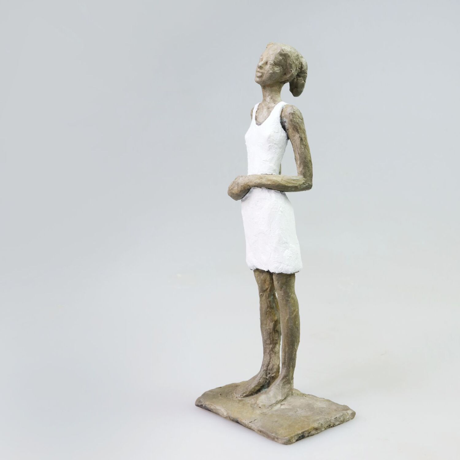 The works of the sculptor Susanne Kraißer, born in Rosenheim in 1977, are in the tradition of figurative sculpture. Her main subject is the classical subject of sculpture and sculpture: the human figure. Kraißer concentrates on the female body. In individual figures, created in series (e.g. Mädchen mit Mini, since 2011; An der Wasserkante, since 2011; Kleine Sitzende, since 2016) or as a singular figure, she primarily thematises formal and essential contrasts such as stability and instability or block-like mass and fragile body formation. In recent years, Kraißer has realised several couple depictions as well as individual figures combined with depictions of fruit or flowers.Susanne Kraißer's bronze sculptures are classic and yet they surprise with new formal inventions, new possibilities of presentation and their very own aesthetics. Kraißer's favourite material is bronze, which she patinates in different ways.