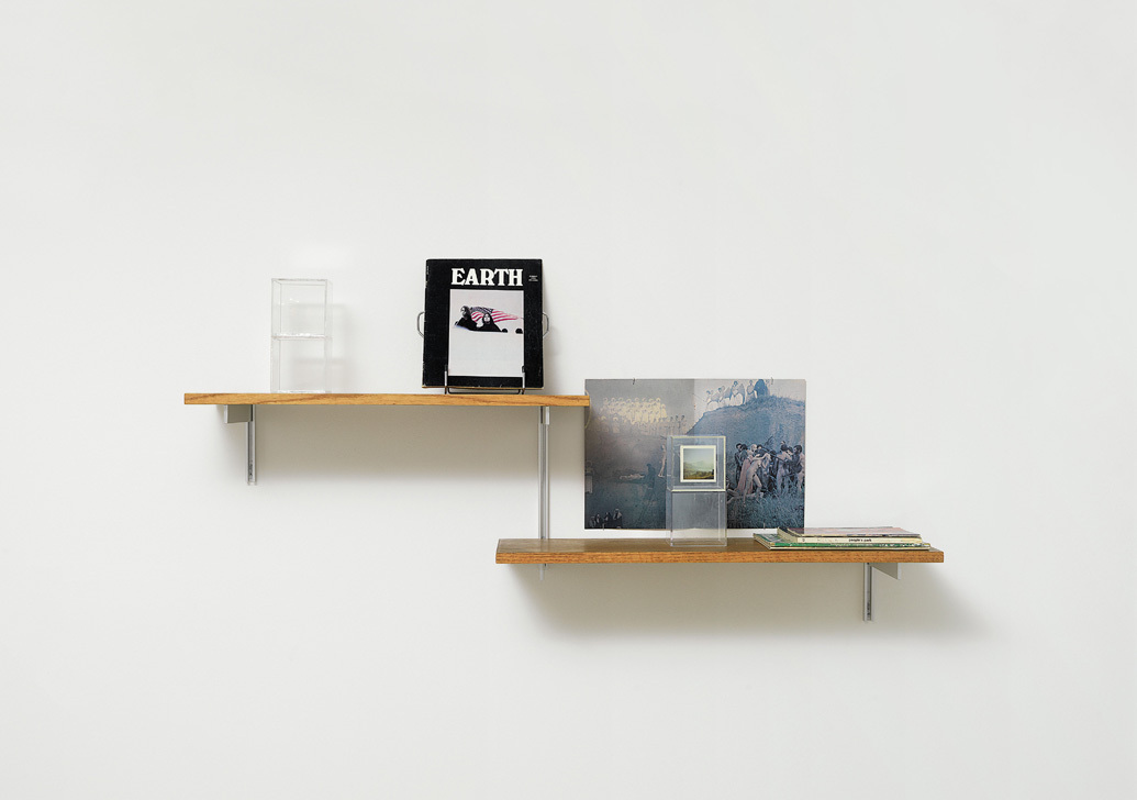 Holz- und Metallregal, 2 Bücher, 3 Zeitschriften, Mischtechnik, 2003